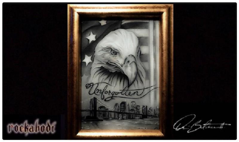 9/11 tribute Created using black and white oil paints on 7x5" Canvas board. Featuring America's National Emblem and mascott, The Bald Eagle with a very fine and micro-miniature detailed New York City skyline set behind The Brooklyn Bridge from The East River with 'Unforgotten' calligraphy protruding. Set in an open 6X9" gilded easel picture frame with a hanging fixture attached as well. A beautiful memorial that will convey ones deepest regards and respect for the ones that perished on that tragic day of September 11, 2001. Buried in the aftermath were the lives of nearly 3,000 men, women and children. and they will forever remain 'Unforgotten'.