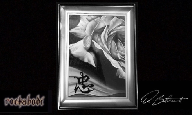Loyalty Rose. Created on 7x5" canvas panel board using Quality oil paints. Blending black and white pigments to create a smooth grayscale effect. With Japanese logogram for loyalty. This Original artwork is mounted in a 9x6" metallic shadowbox picture frame. With an easel backing, as well as a hanging fixture attached on the backside allowing easy display options