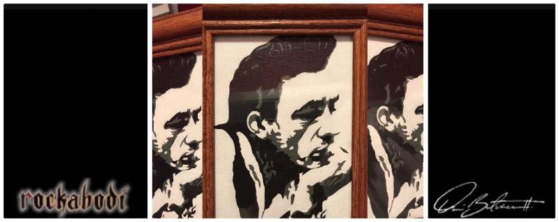 Johnny Cash aka 'The Man In Black'. Created on 5x7" Canvas board using black and grey Acrilic paints. Signed and sealed with a clear coat varnish. Set in a 8x10" American Walnut woodgrain frame. Attached are an easel stand as well as a sawtooth hanging fixture for easy display.