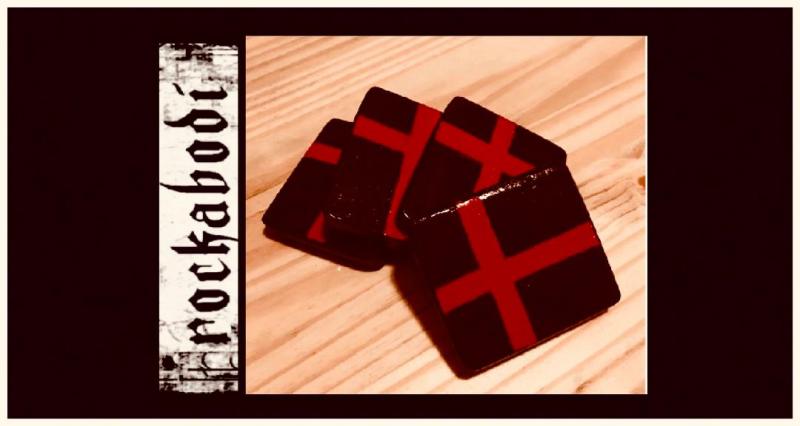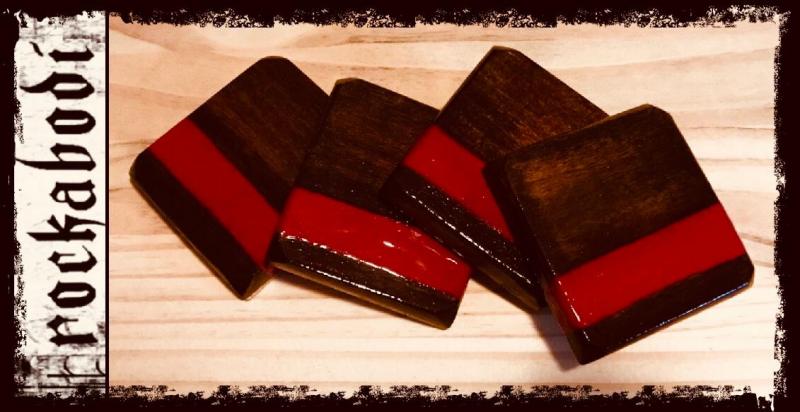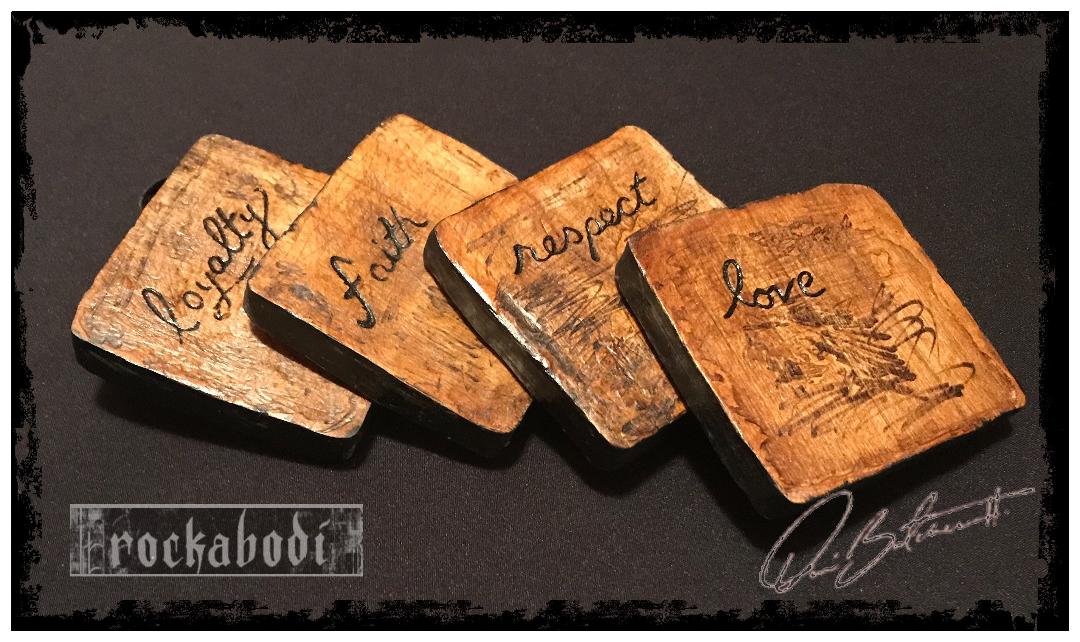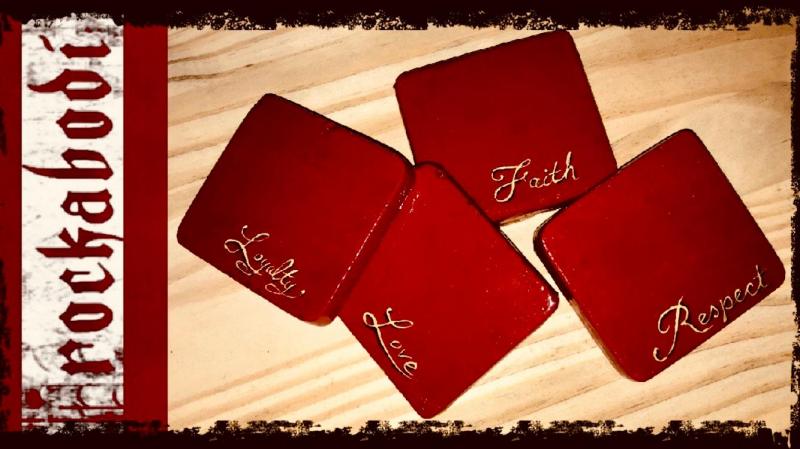 Set of (4) Custom Coasters-Hand crafted from 4x4x1" yellow pine wood. Stained with a Sunrise Red enamel. Each conveying 1 of 4 Virtues-Loyalty, Respect, Faith and Love, freehanded in script. These values, which are the fundamentals as well as the moral standards of Rockabodi Co. Sealed with a coat of tung oil, followed by a twin coat of Polyuerethane as well as a corked backing to prevent condensation and ensuring adequate protection for your furniture. These Coasters are a great gifting idea or for get togethers with family and friends!