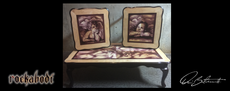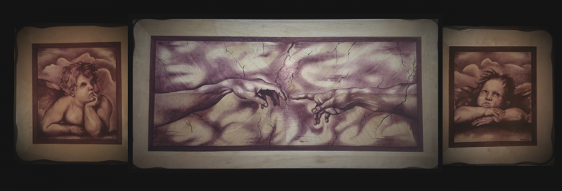 Black cherry table set (3 Pc.) Includes coffee table with recaptured artwork of (Michaelangelo's:The Creation of Adam) as well as 2 end tables with recaptured artwork from (Raphael Sanzio's: Sistine Madonna Cherubim.